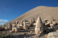 Mont Nemrut (2160 mètres), la plus haute montagne du nord de la Mésopotamie où, sur le sommet, Antiochos Ier, roi de Commagène, fit construire un sanctuaire dans lequel il fut enterré. D'un diamètre de 145 mètres et haut de 50 mètres, le tumulus construit à partir d'éclats de pierres est flanché de trois terrasses sur ses façades est, ouest et nord. Neuf statues de plus de huit mètres de haut dont la tête à elle seule dépasse les deux mètres, trônent devant une esplanade vouée au culte. Ce site impressionnant, classé depuis 1987